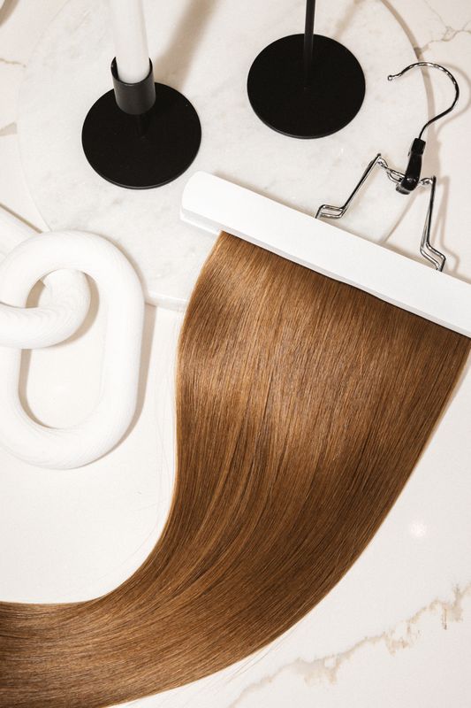 The perfect warm light brown. About a level 7. One of our most common shades to mix with blondes as a dimensional piece, or natural brunettes as a solid.